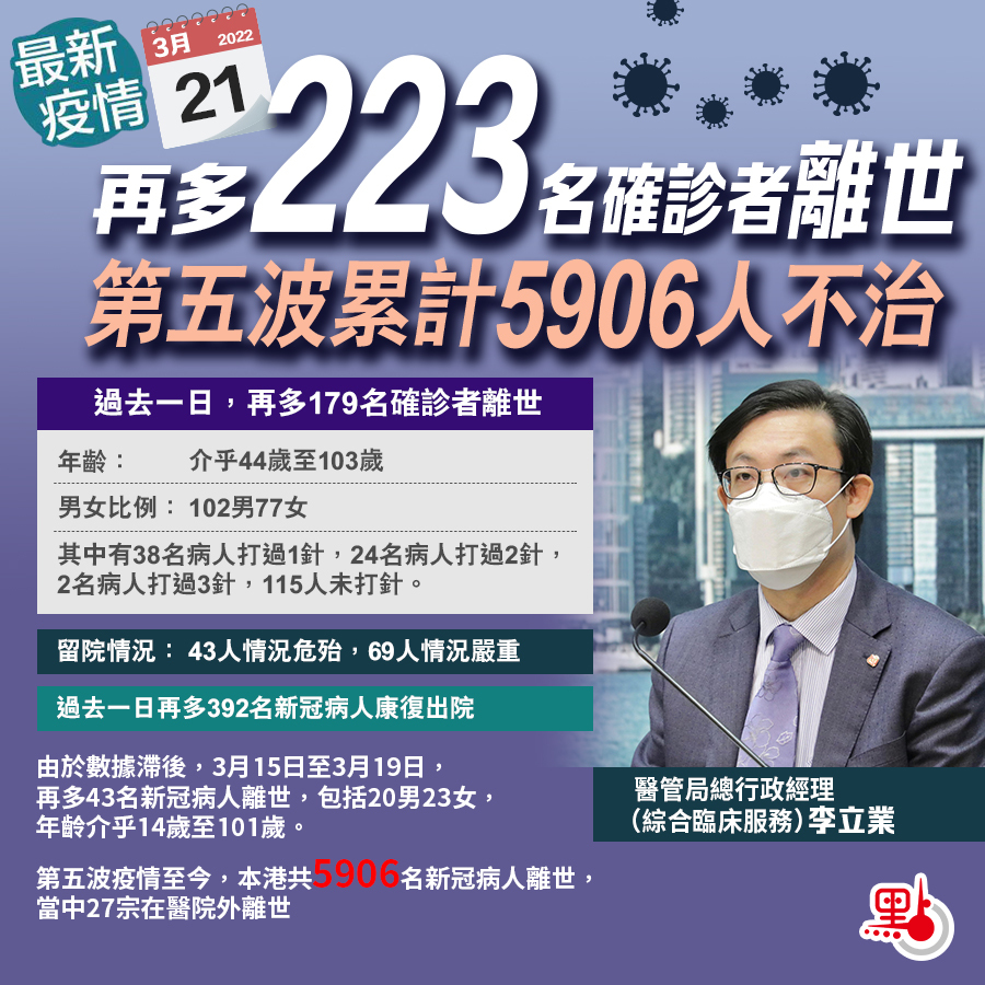 醫院管理局總行政經理(綜合臨床服務)李立業今日在疫情記者會上公布,過去一日再多179名確診者離世,年齡介乎44歲至103歲,分別為102男77女,其中有38名病人打過1針,24名病人打過2針,2名病人打過3針,115人未打針;由於數據滯後,3月15日至3月19日,再多43名新冠病人離世,包括20男23女,年齡介乎14歲至101歲。
