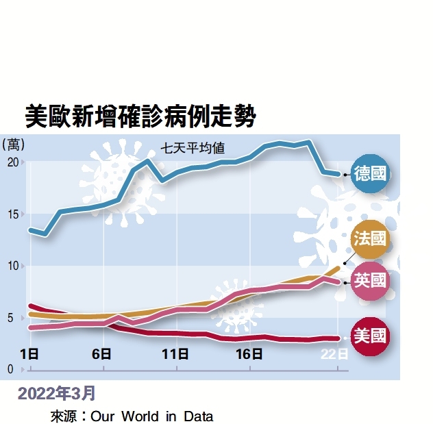 克魯格表示,過去7天歐洲地區新增超過510萬宗確診病例。德國於20日撤銷大部分防疫措施,與此同時每百萬人新增病例數創下2619宗的最高紀錄;法國上周取消了在室內戴口罩等要求,每百萬人新增病例數隨即飆升至1331人,較本月初幾乎翻倍。
