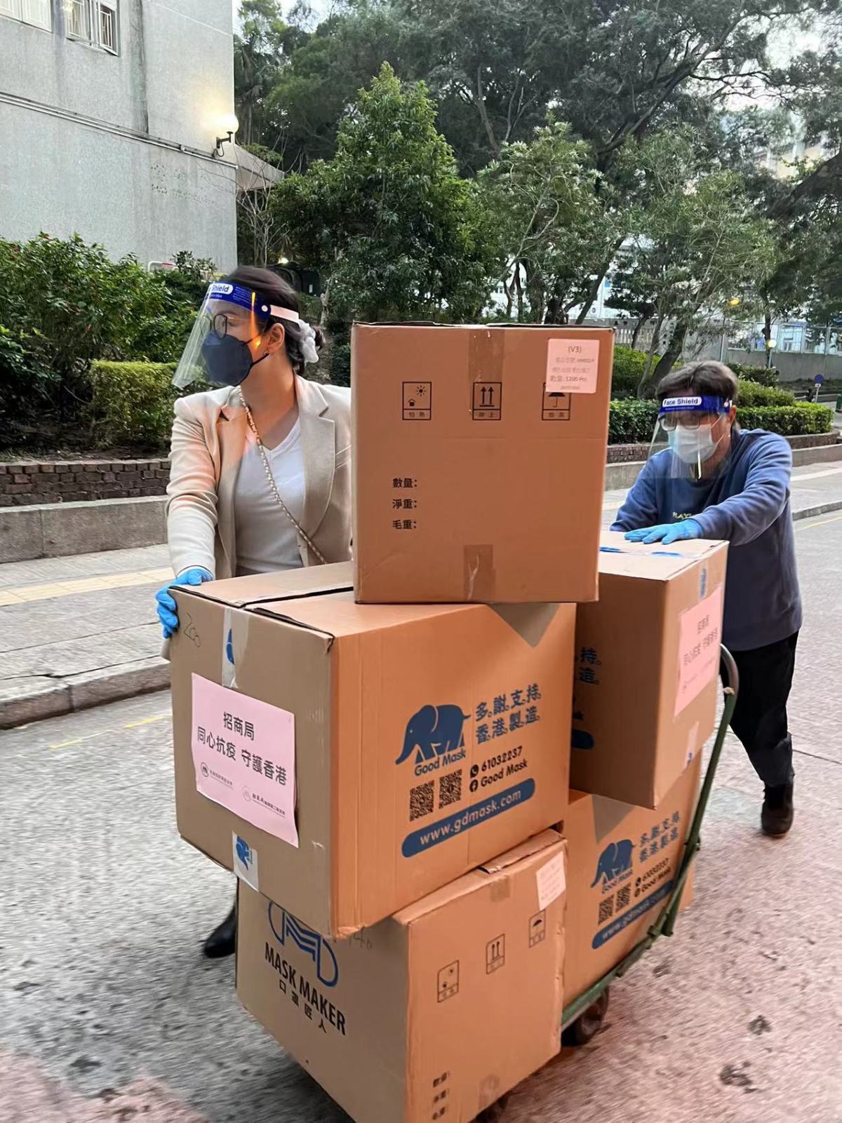 疫情初來襲時,市面上口罩供不應求,價格居高不下,許多低收入人士根本用不起口罩。面對這樣的困境,郭宣彤用盡了身邊所有的關係網絡,最終找到一批在孟加拉國生產的外科口罩,毫不猶豫以175港元一盒的價格一次性購入200盒,幾經輾轉運到香港後,又組織招商局的義工們利用工作之餘進行分裝,並第一時間派發給有需要的居民,以解他們的燃眉之急。
