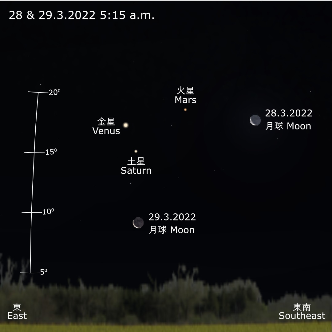 香港太空館日前在Facebook表示,3月28日及29日黎明時分(早上5時15分左右)將出現「三星伴彎月」的天文現象,日出前金星、火星和土星「三星」將互相靠近,再加上一彎月亮,若雲量不多,肉眼也能觀測到。三顆行星中,金星最光亮,顏色偏白;橙紅色的火星和淡黃的土星則比較暗淡,分別在金星的右方和右下方。