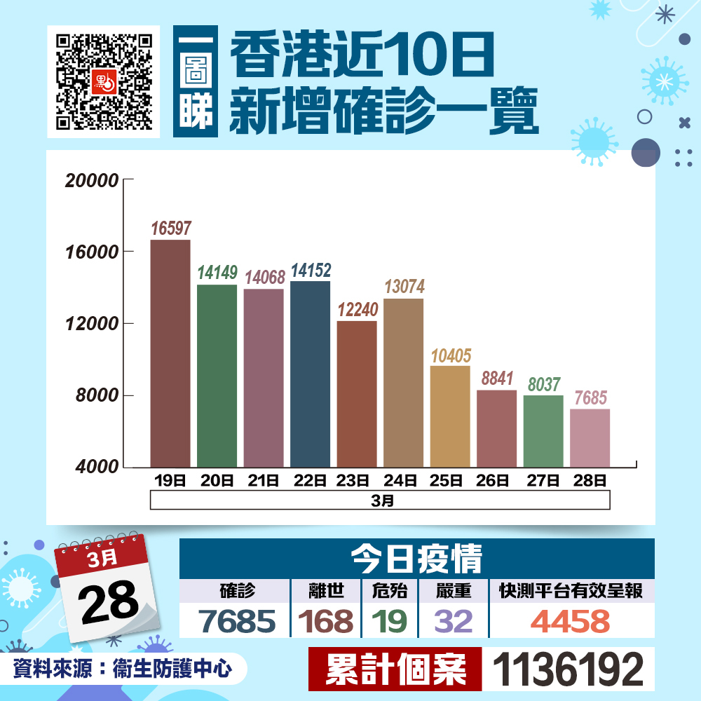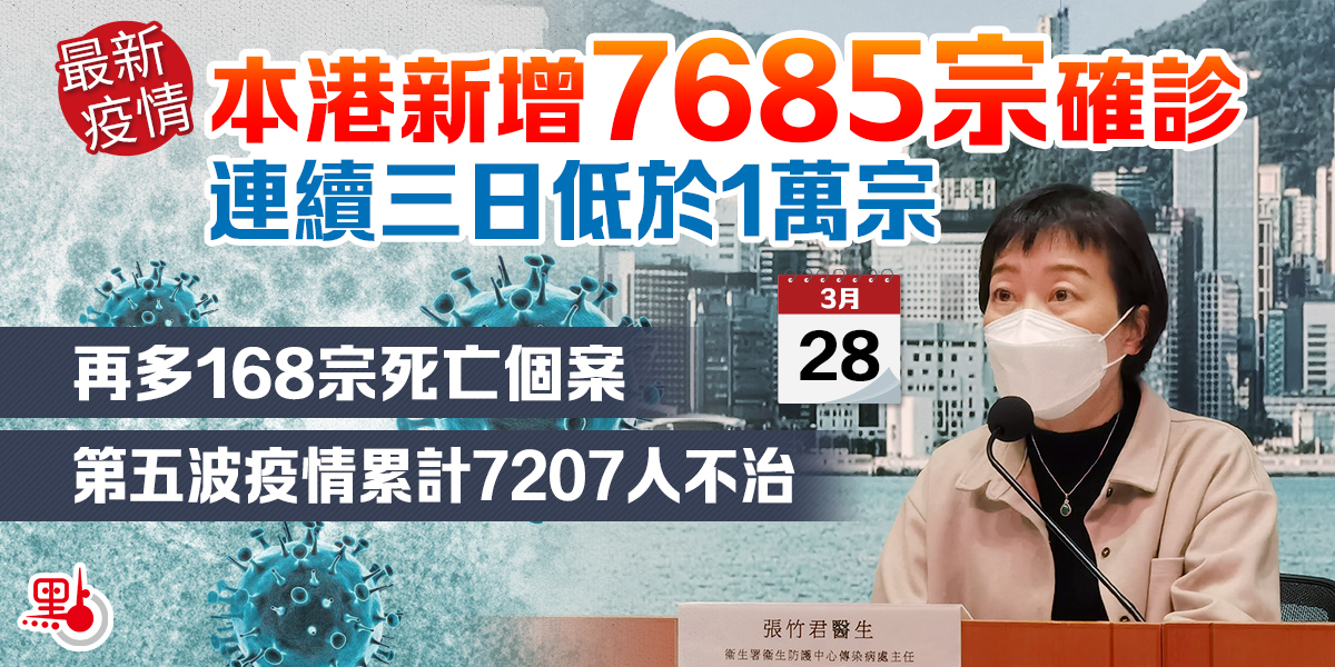 本港第五波疫情嚴峻,衞生署及醫管局今日(28日)下午舉行疫情記者會。衞生署衞生防護中心傳染病處主任張竹君公布,截至今日零時,本港新增7685宗確診個案,當中3227宗經核酸檢測確診,餘下4458宗為快速抗原測試呈報有效個案。本港第五波疫情累計個案1123561宗。