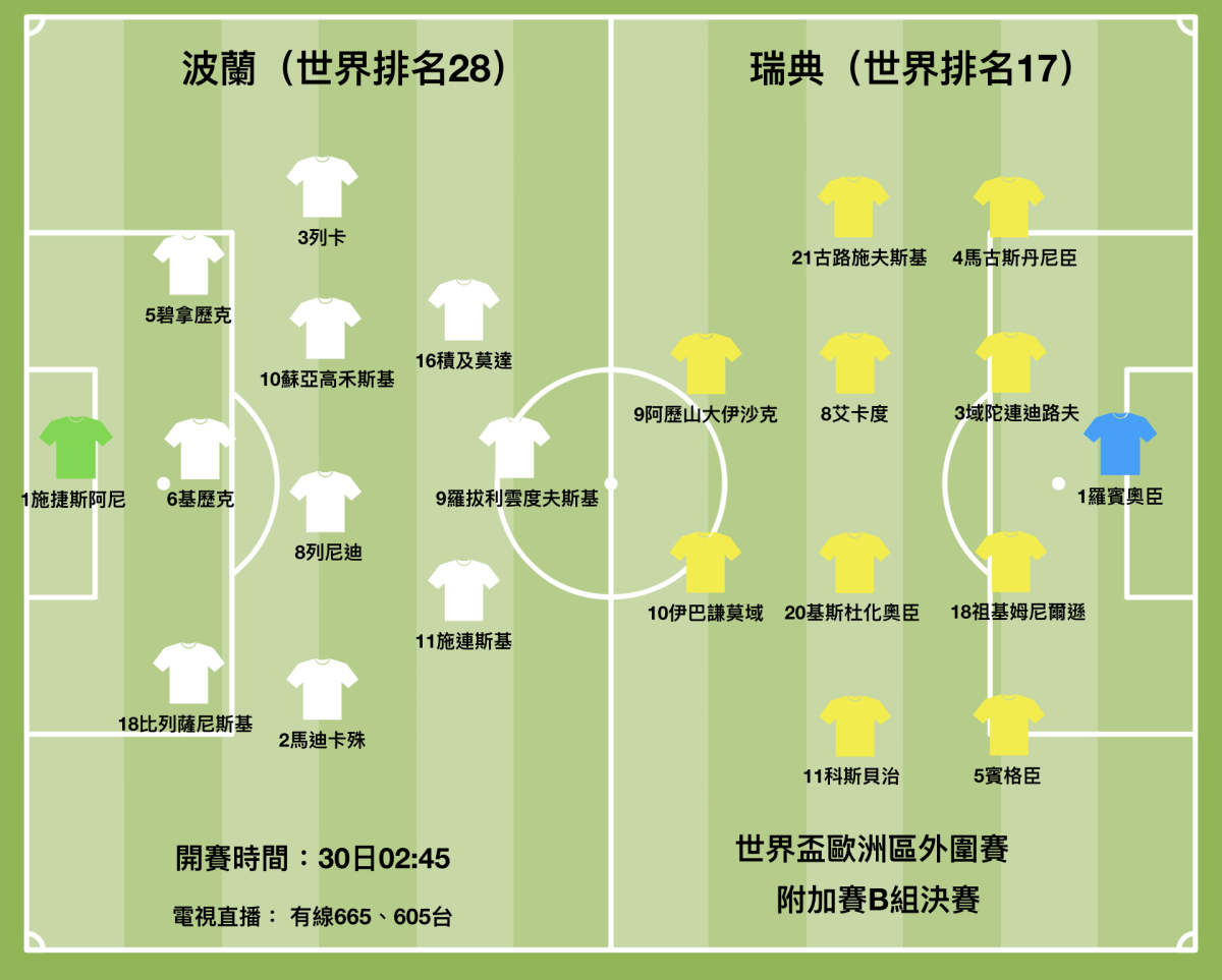 利雲度夫斯基雖然曾經在2018年世界盃決賽周上陣,但表現失色下未能協助波蘭在分組賽中晉級。在加冕世足先生名銜後,這次他欲捲土重來,而波蘭隊在外圍賽表現穩健,以僅次於英格蘭的成績躋身附加賽。由於俄羅斯隊被禁止參加國際賽,波蘭直接晉級到附加賽決賽,而在主場之利下,在體能和備戰上都較瑞典隊有利。波蘭隊早前由於將帥不和,葡國教練保羅蘇沙離任,由備受球員敬重的米捷尼域斯接手,而在米利克、碧拿歷克、馬迪卡殊等英超、意甲、德甲兵在陣下,波蘭隊具備相當雄厚的實力。