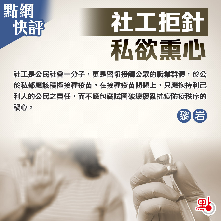 雖然打不打針是社工個人的權力,但當涉及影響到他人利益就並非個人權利這麼簡單。社工是公民社會一分子,更是密切接觸公眾的職業群體,於公於私都應該積極接種疫苗。在接種疫苗問題上,只應抱持利己利人的公民之責任,而不應包藏試圖破壞擾亂抗疫防疫秩序的禍心。