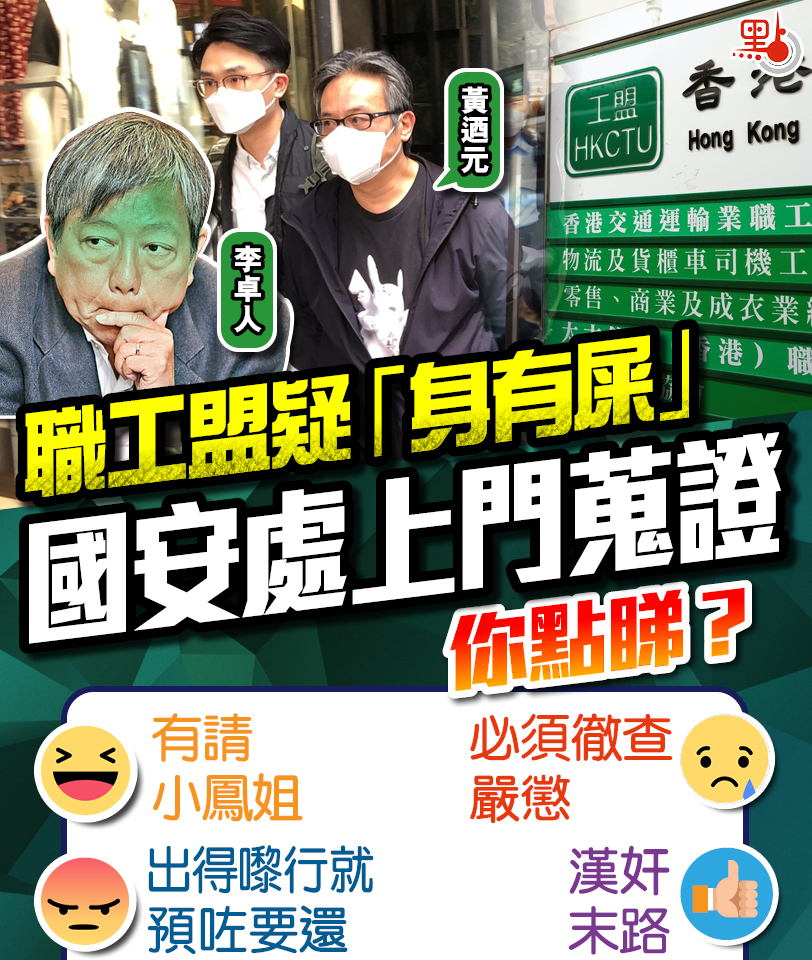 職工盟被指多年來勾結外部勢力及收受政治「黑金」,擾亂香港。警方在今年2月根據《社團條例》第15條,向「職工盟」骨幹成員發信,要求提供相關資料,包括組織運作、過往活動、收入來源及開支、與屬會及外國或境外組織的聯繫等,惟組織未有依時提交資料,擺明是「身有屎」。警方國安處昨日上門帶走相關人士協助調查,警方同時亦向法庭申請手令,搜查多個職工盟辦事處。