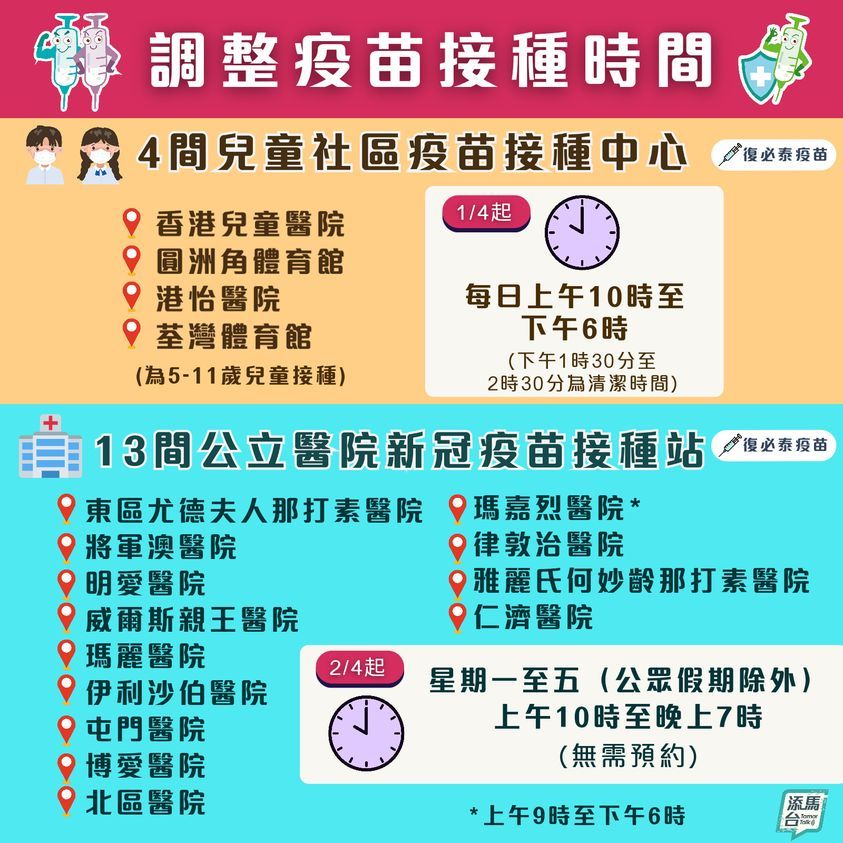 政府今日(1日)在社交專頁「添馬台」發文,指為更靈活調配醫護資源,4間兒童社區疫苗接種中心及13間公立醫院接種站4月起調整運作時間。受影響的預約人士將會收到電話短訊,通知新的接種日期和時間。