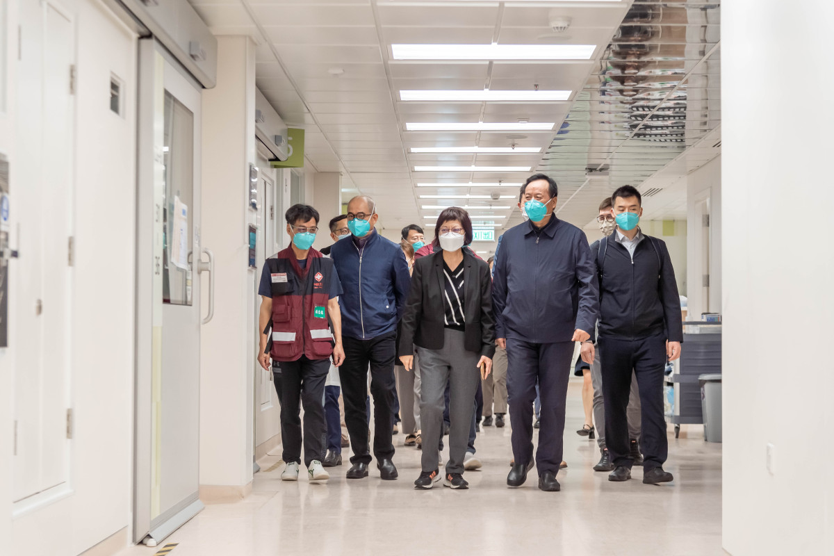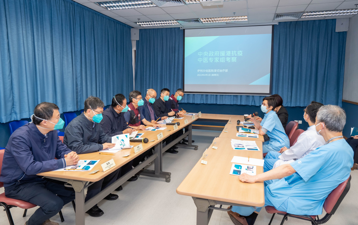專家組其後到訪亞洲國際博覽館的新冠治療中心,了解中心的運作模式,並與駐診中醫師就「新冠住院病人中醫特別診療服務」的推展交流。專家組亦在香港醫療團隊及內地援港醫療隊成員陪同下,進入隔離區域親自了解病人情況,並就個案進行研討。