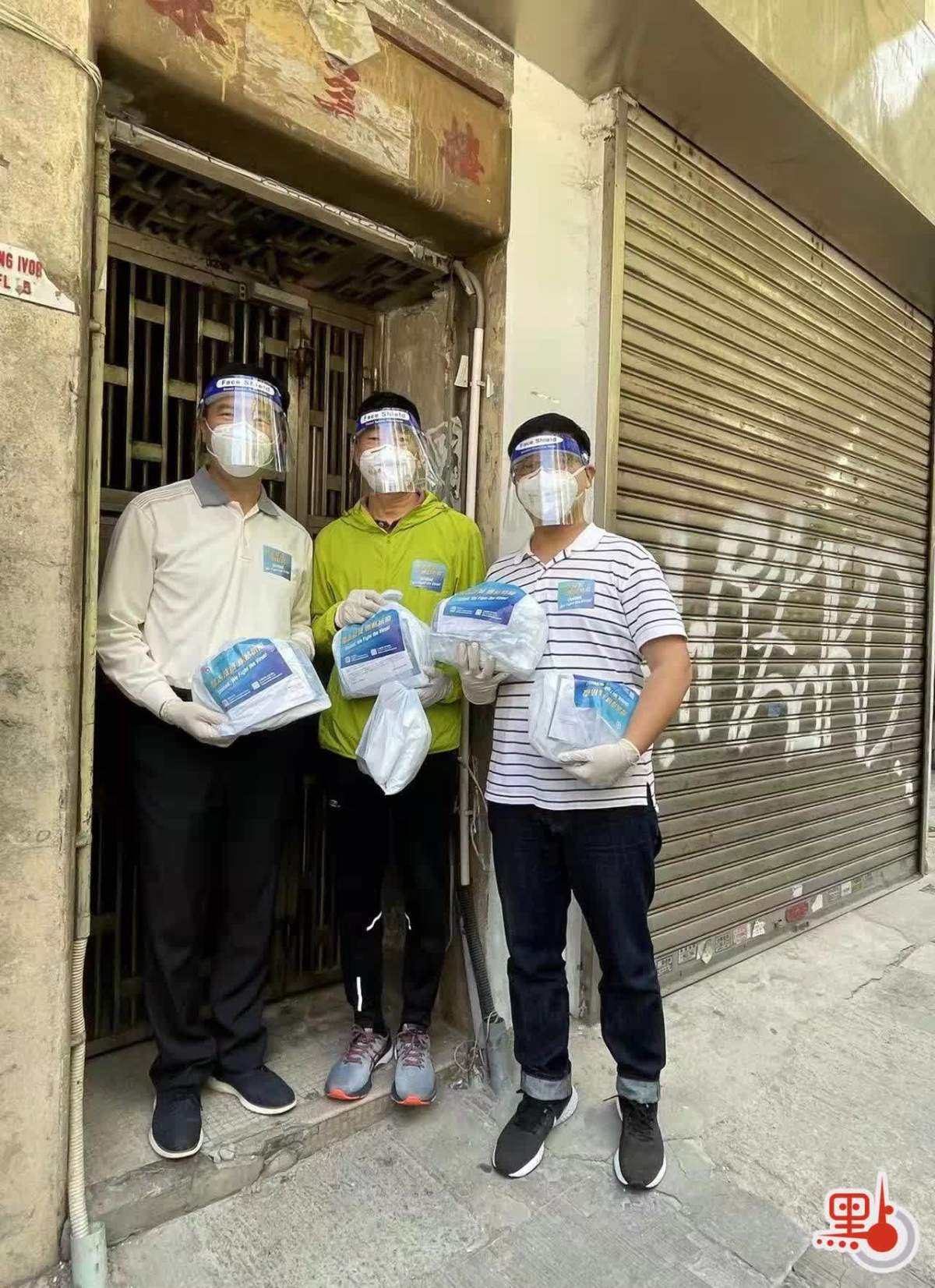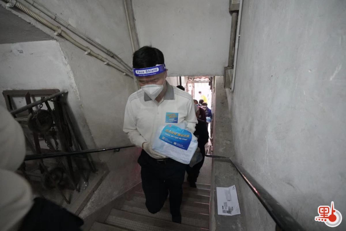 政府「防疫服務包」派發活動在全港各個區持續進行。今日(3日)中午,署理民政事務局局長陳積志、中西區民政事務專員梁子琪與「G19」嚴剛、譚岳衡、李浩然等十名立法會議員落區向西營盤水街樓宇住戶派發防疫包。
