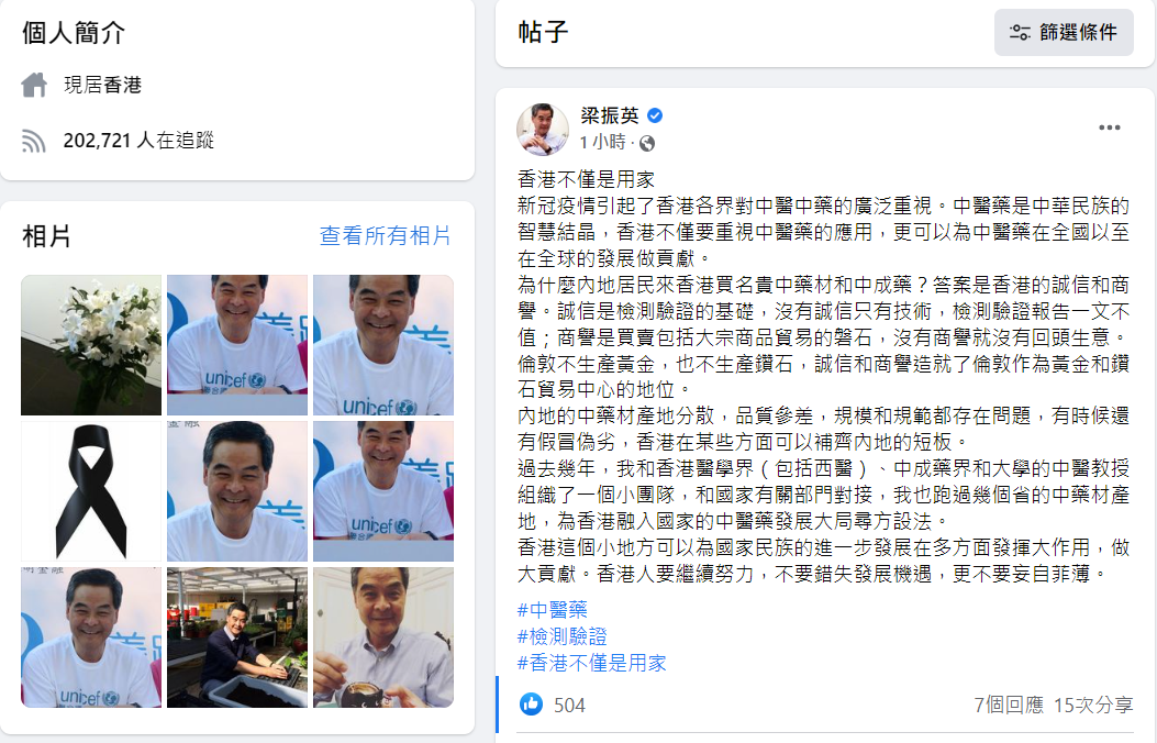梁振英續說,內地的中藥材產地分散,品質參差,規模和規範都存在問題,有時候還有假冒偽劣,香港在某些方面可以補齊內地的短板。而過去幾年,他和香港醫學界(包括西醫)、中成藥界和大學的中醫教授組織了一個小團隊,和國家有關部門對接,也跑過幾個省的中藥材產地,為香港融入國家的中醫藥發展大局尋方設法。