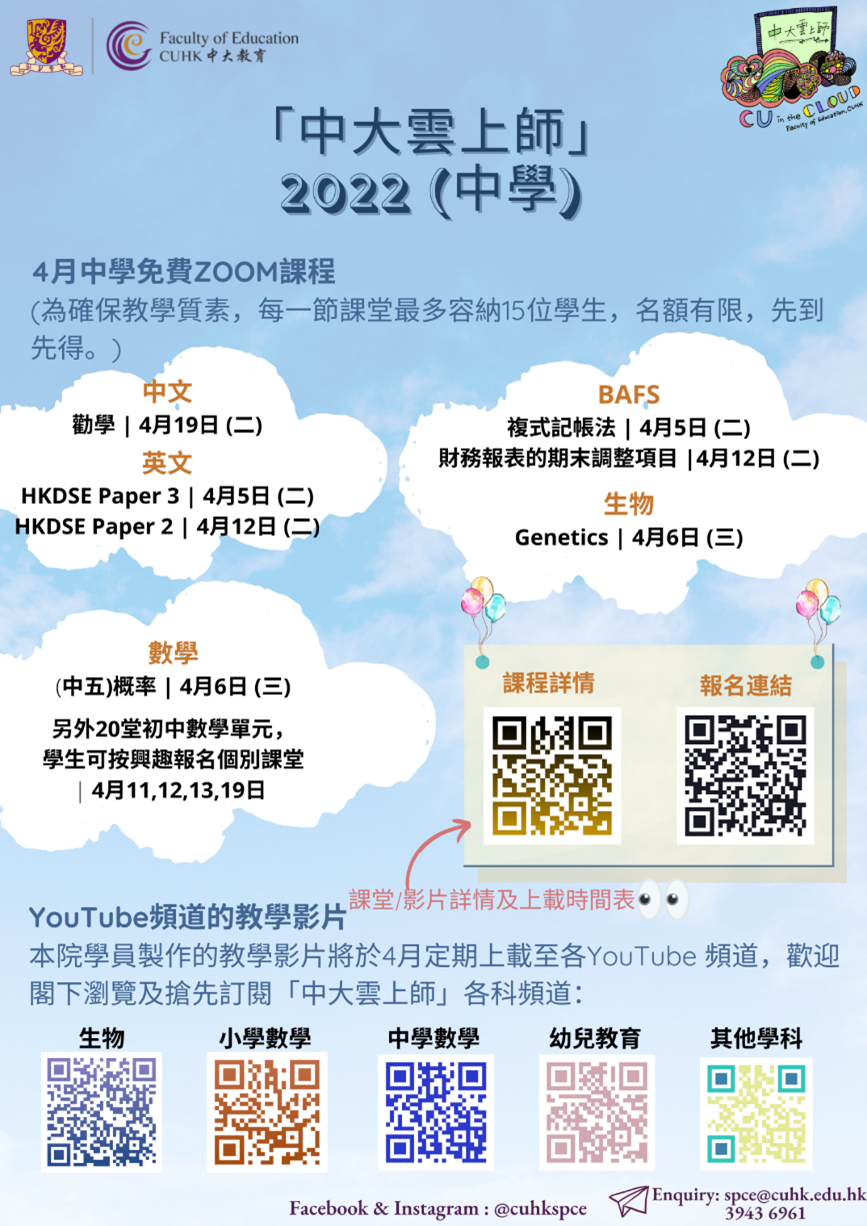 中大教育學院組織學院的師生及資深中學老師,在四月提供逾40堂實時網上課堂,涵蓋多個學科範疇,包括中英數以及部分文憑試科目;又會舉辦多場文憑試公開講座。此外,中大教育學院的學員製作了逾80條教學影片,讓學生加深對一些重要學科知識的理解,歡迎考生隨時重溫。