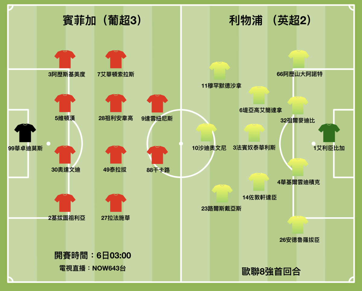 利物浦最近4連捷,但贏波均是1球起、2球止,反映隊伍是有很精確的評估。由於迪亞高祖達近況大勇,穆罕默德沙拿和沙迪奧文尼保持穩定水準,加上華基爾雲迪積克、祖爾麥迪比和法賓奴泰華利斯的防守「鐵三角」回復昔日的穩健,這支「紅軍」或會有更勝於前屆英超掄元、大前屆歐聯稱霸的收穫。 據說今仗葡萄牙國腳路爾斯戴亞斯會率先上陣,或會與葡萄牙晉級世盃決賽周的功臣祖達一起「以葡制葡」。主帥高洛普在賽前搞氣氛大講笑料,說他想從戴亞斯口中打聽對方軍情,竟然聽了戴亞斯說了10分鐘也完全聽不𢤦一個字。