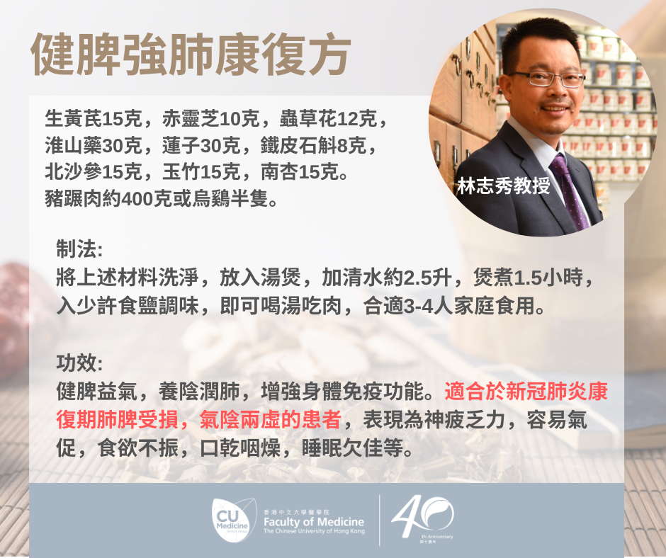 中大醫學院今日(5日)在社交媒體指出,從中醫角度來看,新冠肺炎恢復期大多屬中醫學「疫病」後期「肺脾受損」及「氣陰兩虛」的範疇。中大香港中西醫結合醫學研究所所長兼中醫學院副院長林志秀教授介紹以下一款中藥湯水,可助新冠康復者健脾益氣,養陰潤肺,增強身體免疫功能,加快復原。