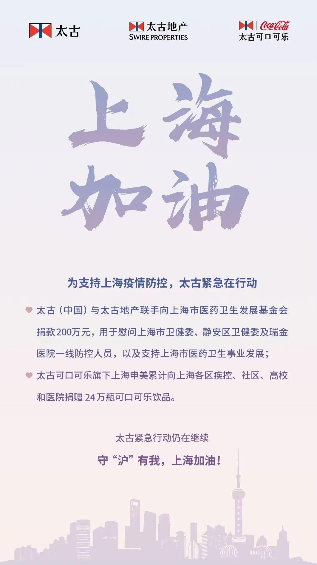 上海疫情發展迅速,疫情防控正處在關鍵時期。為支援上海應對疫情,太古(中國)與太古地產近日聯手向上海醫藥衞生發展基金會緊急捐款人民幣200萬元,用於慰問上海市衞健委、靜安區衞健委以及瑞金醫院一線防控人員,以及支持上海市醫藥衞生事業發展。