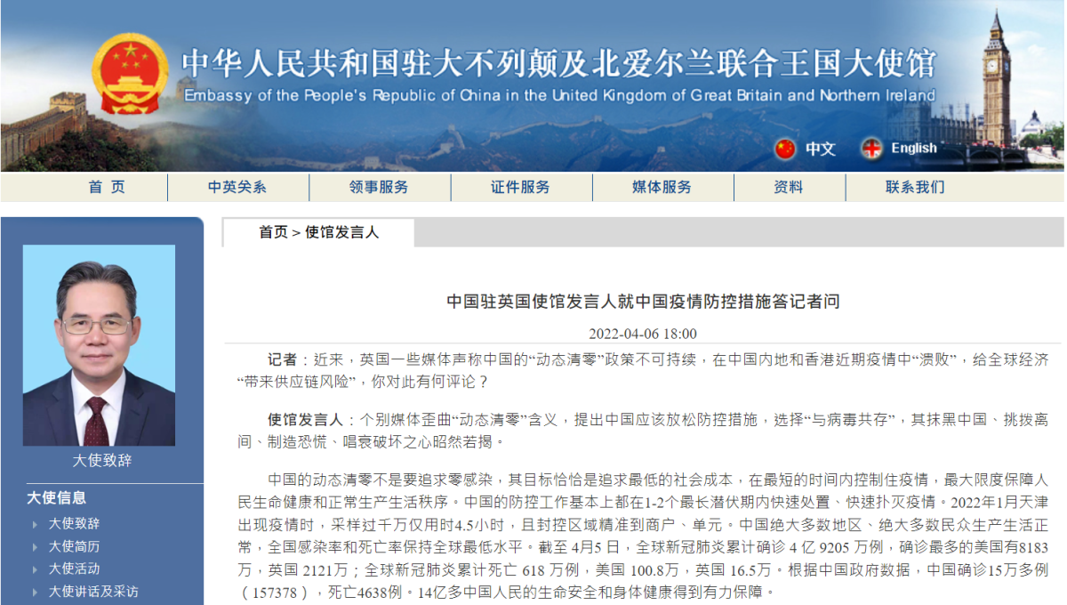 針對英國近期一些傳媒聲稱中國的「動態清零」政策不可持續,為全球經濟帶來供應鏈風險的說法,中國駐英國大使館發言人4月6日表示,個別媒體歪曲「動態清零」含義,提出中國應該放鬆防控措施,選擇「與病毒共存」,其抹黑中國、挑撥離間、製造恐慌、唱衰破壞之心昭然若揭。使館發言人強調,中國堅守「動態清零」是對國際抗疫和全球經濟穩定復甦的最大貢獻。