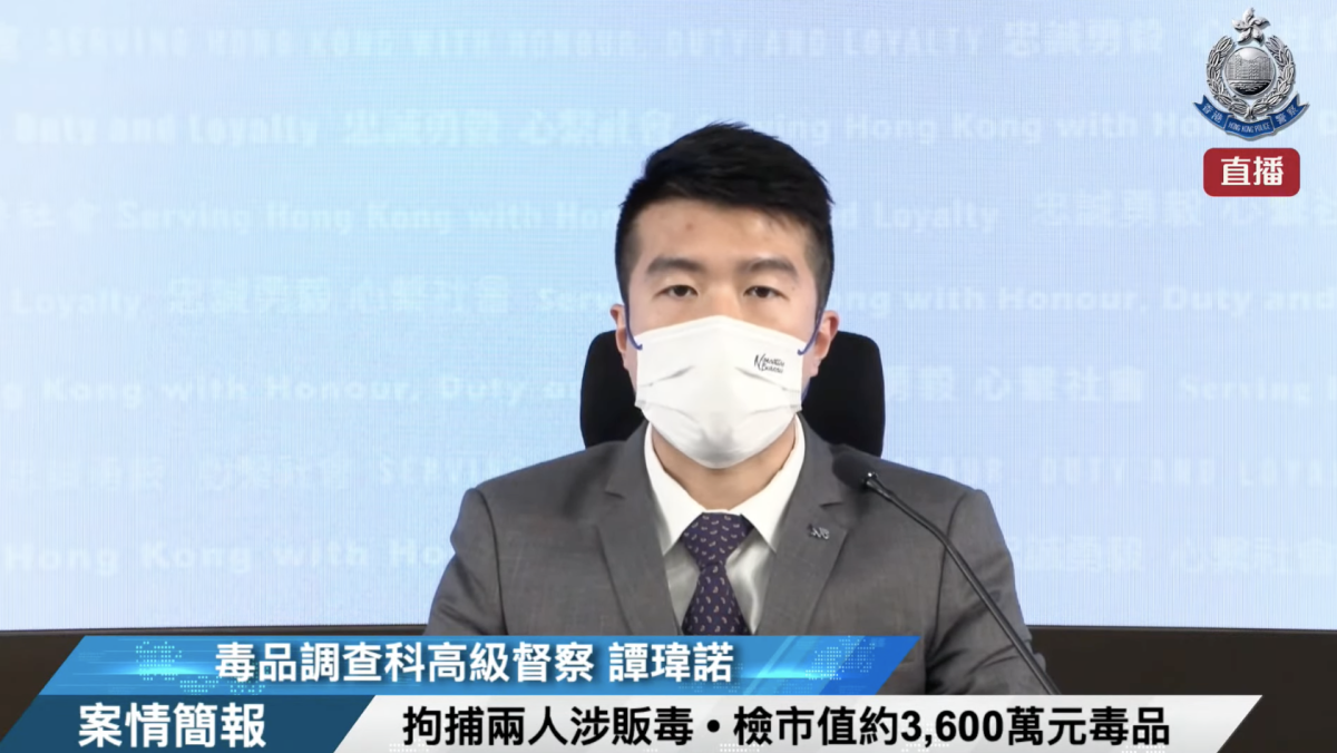 警方昨日(8日)於屯門進行打擊毒品行動,以「販賣危險藥物」罪拘捕一男一女,年齡分別為26及31歲,並檢獲總共約61公斤懷疑冰毒、氯胺酮及可卡因,市值約為3600萬元。 警方毒品調查科高級督察譚瑋諾向傳媒簡報案情。