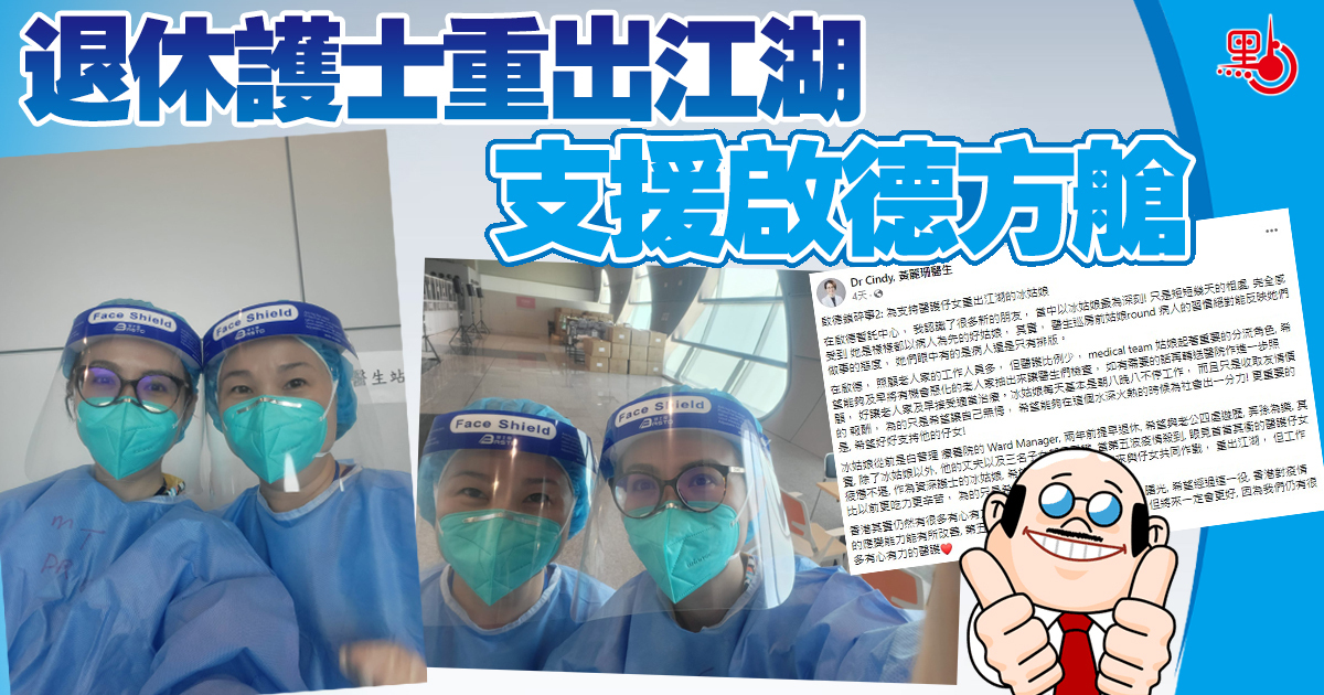 第五波疫情持續,加入啟德方艙醫院協助抗疫的臨床腫瘤科專科醫生黃麗珊,日前在fb分享一名為支持任醫護的子女,而重出江湖的退休護士故事。她表示在啟德暫託中心,短短幾天的相處,完全感受到對方是樣樣都以病人為先的好姑娘。