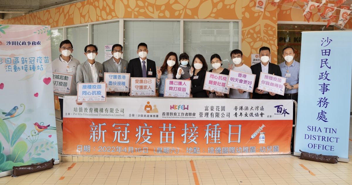 因應本港第五波疫情有緩和趨勢,全港學校下周二(19日)起分階段恢復面授課堂。今日(16 日),培僑教育機構為支援政府的抗疫工作,攜手沙田民政事務處、教聯會、富豪花園管理有限公司及粵港澳大灣區青年交流協會於培僑國際幼稚園共同舉辦「新冠疫苗接種日」活動,協助沙田區市民接種科興疫苗。