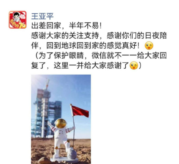王亞平周日(17日)晚上在社交網站發文指,出差回家,半年不易,感謝大家的關注支持及日夜陪伴,形容「回到地球回到家的感覺真好!」有內地媒體形容,這是「王亞平返回地球後第一條朋友圈」。