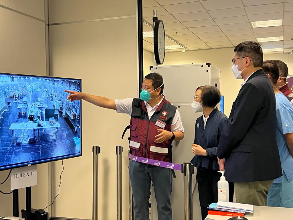 食物及衞生局局長陳肇始今日(18日)視察亞洲國際博覽館,了解中心內的醫護人員對新冠肺炎病人的治療護理工作,以及與內地援港醫療隊交流。