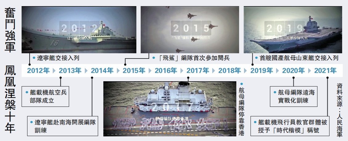 此外,片中還細數了自2012年以來十年間,包括遼寧艦交付入列、編隊停靠香港、南海大閱兵等航母年度大事記。