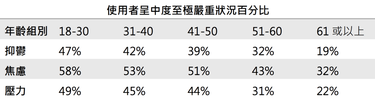調查搜集了3749位平台使用者的網上問卷,發現約47%使用者出現中度至非常嚴重的焦慮症狀,即每兩人有一個疑似焦慮。36%使用者出現中度至非常嚴重的抑鬱症狀,及38%使用者呈中度至非常嚴重的壓力症狀。換言之至少三成人的精神健康狀況達臨床關注水平,當中以18至30歲屬高危群組。