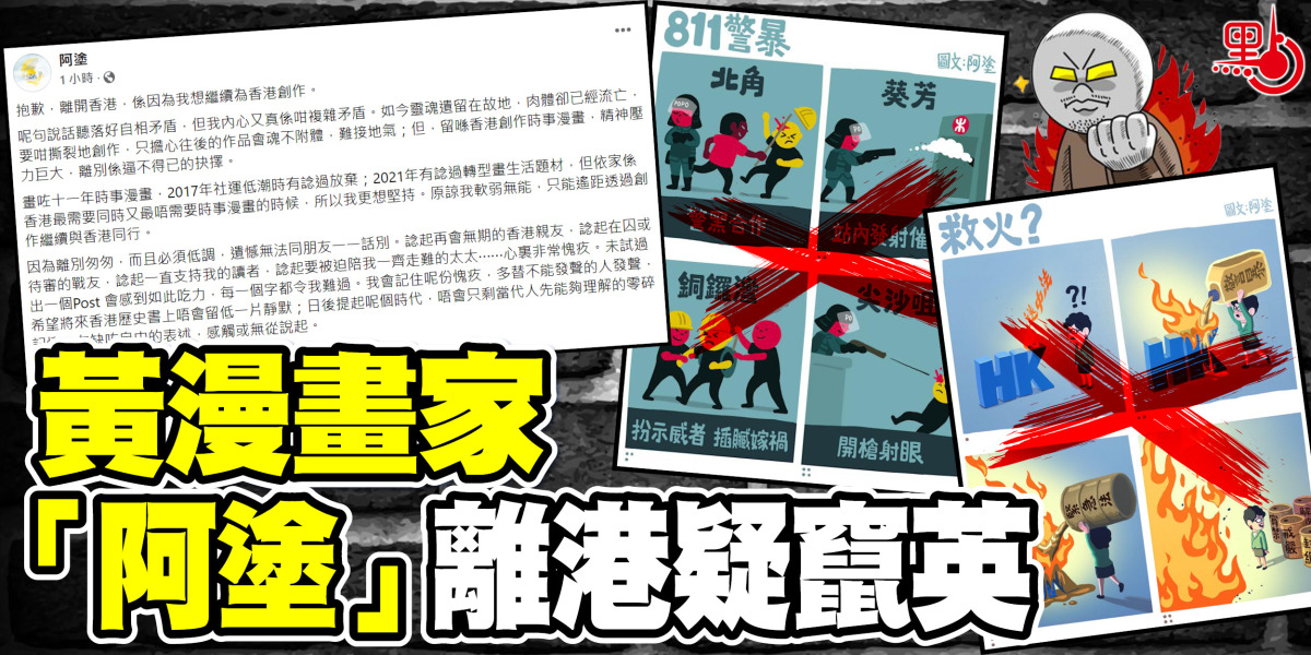 「阿塗」在帖文聲稱,「留喺香港創作時事漫畫,精神壓力巨大,離別係逼不得已的抉擇」。佢話自己內心複雜矛盾,遺憾無法同朋友一一話別,「諗起再會無期的香港親友,諗起在囚或待審的戰友,諗起一直支持我的讀者,諗起要被迫陪我一齊走難的太太⋯⋯心裏非常愧疚。」佢指未試過出一個帖文會感到如此吃力,叫人原諒佢軟弱無能,話只能遙距透過創作繼續與香港同行喎。