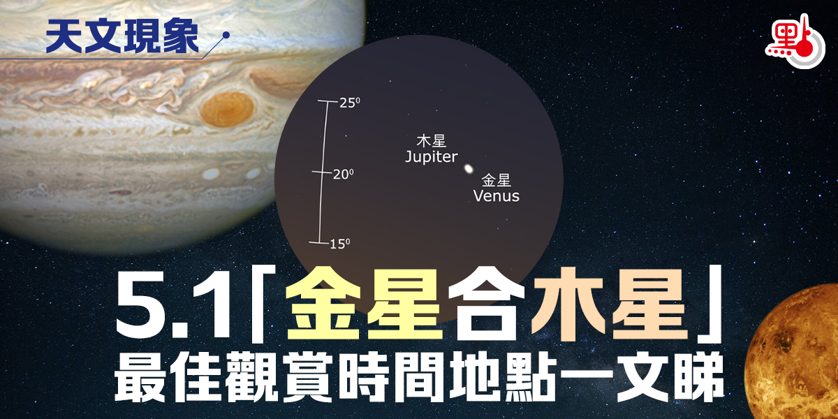 本周日(5月1日)香港夜空即將出現「金星合木星」天文現象,兩顆行星相合且角距離較小,美麗動人!