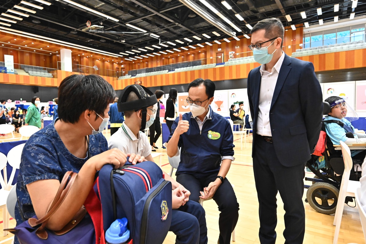 公務員事務局局長聶德權到沙田圓洲角體育館兒童社區疫苗接種中心為小朋友打氣。聶德權表示,今次已是第三次安排特殊學校的學生集中接種疫苗,他們對接種新冠疫苗已有一定經驗,這是第一次集中安排他們到兩間兒童社區疫苗接種中心,加快接種程序。「今日接種疫苗的學生各有不同的需要,有些小朋友注意力不足,或有一些嚴重障礙,往往特別需要醫護人員的支持和配合。」聶德權感謝醫護人員,亦多謝家長支持疫苗接種。