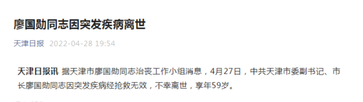 據天津市廖國勛同志治喪工作小組消息,4月27日,中共天津市委副書記、市長廖國勛同志因突發疾病經搶救無效,不幸離世,享年59歲。