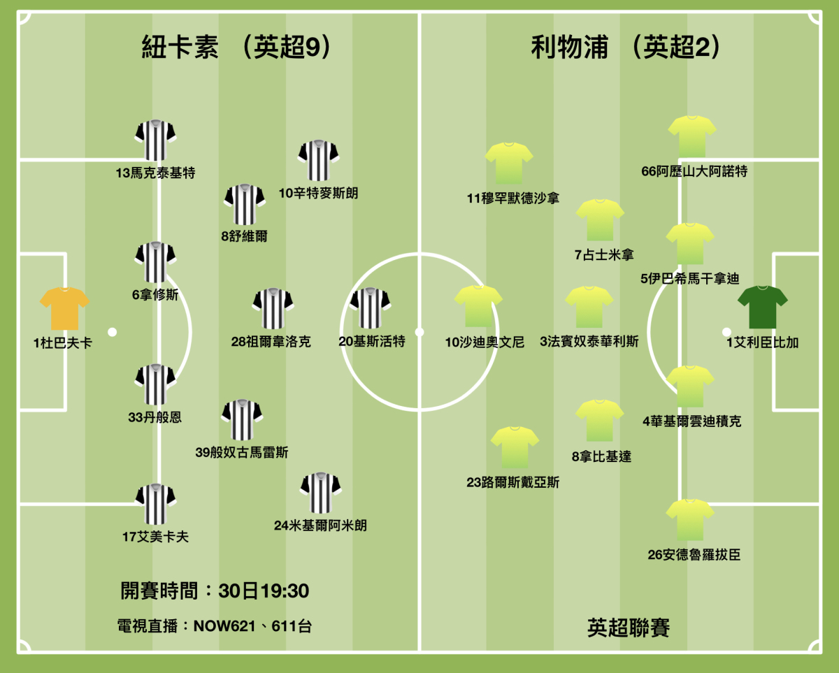 紐卡素經歷4連勝後,已經從護級墊底隊伍跳升至聯賽榜第9位,不愁降班之下,餘下幾仗只屬「風流波」。紐卡素本屆在聯賽面對曼城、利物浦、車路士、熱刺四大勁旅均落敗收場,看來在護級成功後,主帥艾迪路維需要更多資金擴軍,以在下屆爭取歐洲賽事資格。不過,從他走馬上任後,只購入基斯活特、捷比亞等實而不華的球員可見,他在下屆能夠購得巨星的機會不高。據悉祖連頓在上仗大破諾域治3:0一役梅開二度,故此他仍會搶走基斯活特的正選席位。紐卡素今仗有哥林威爾遜、捷比亞、賴恩費沙因傷缺陣,預計在士氣高漲之下,會放膽與利物浦搶攻,希望對手體力未及恢復偷雞。