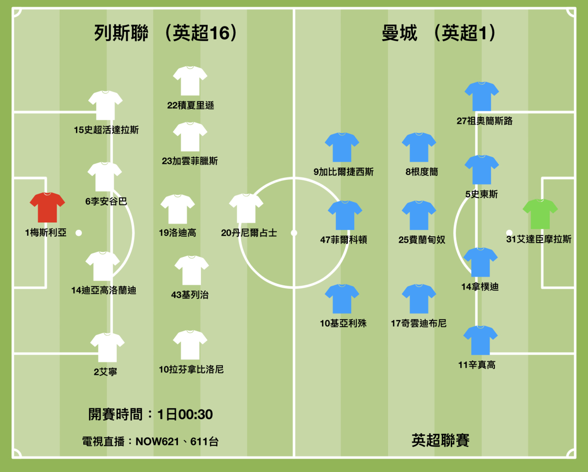 雖然曼城在歐聯4強首回合以4:3勇勝皇馬,打出本屆代表作,但隨即在英超作客遇到近況不俗的列斯聯,該支榜首隊伍若未恢復最佳狀態,隨時有陰溝翻船之虞。(香港時間周日凌晨零時三十分開賽,NOW621、611台直播)