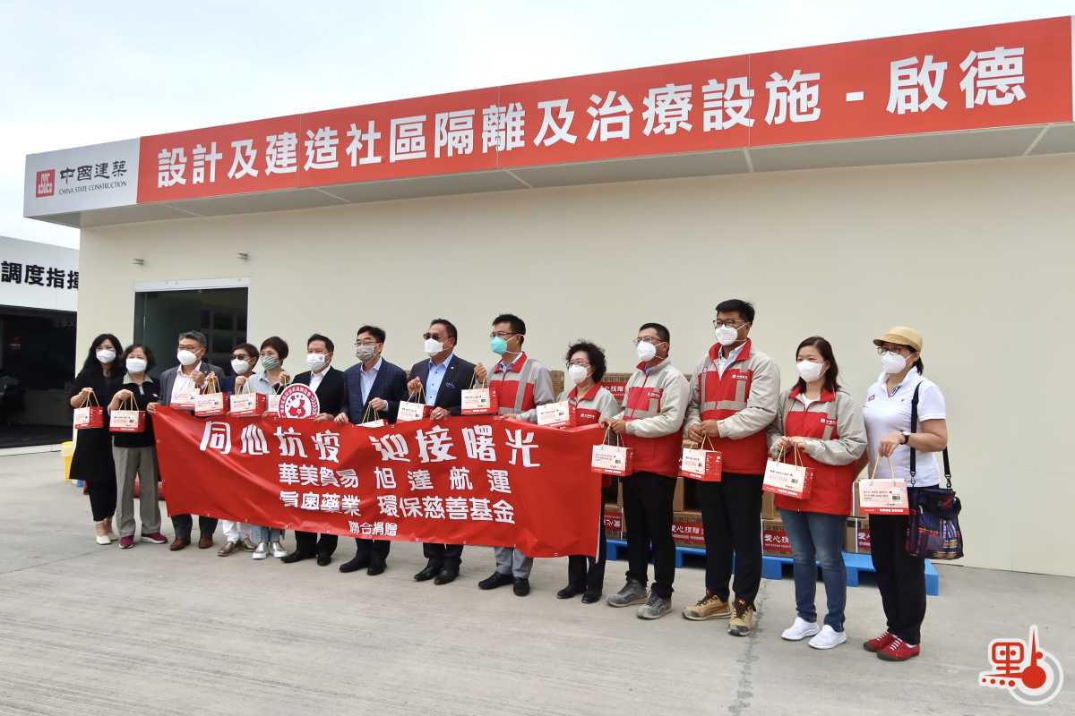 多個愛心企業今日(30日)下午於九龍城區啟德方艙社區隔離及治療設施建設項目舉行「同心抗疫,迎接曙光」愛心捐贈儀式,「旭達國際物流集團」董事長蘇永安先生代表「華美貿易」、「旭達航運」、「真奧藥業」、「環保慈善基金」,向啟德、竹篙灣、元朗潭尾方艙全體工作人員捐贈280箱抗疫物資,感謝他們為香港戰勝疫情的辛勤付出。