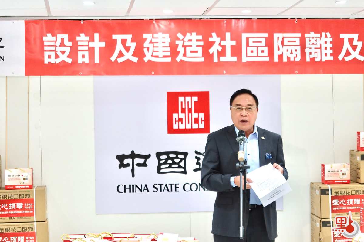 蘇永安在捐贈儀式上致辭表示,在香港防疫抗疫嚴竣時刻,中央政府果斷伸出援手,在極短時間內建成啟德、竹篙灣、元朗潭尾等8個社區隔離及治療設施建設項目,為大量、快速收治新冠患者,有效控制疫情蔓延,發揮了關鍵性作用,香港市民對中央政府非常感謝。而在方艙的工作人員臨危受命,奉行「搶工程就是搶生命」的光榮使命,廿四小時日夜施工,堅守崗位,全天候投入服務,為香港抗疫工作無私奉獻,他們高尚情操令人欽佩,亦令香港戰勝疫情有了「定心丸」。