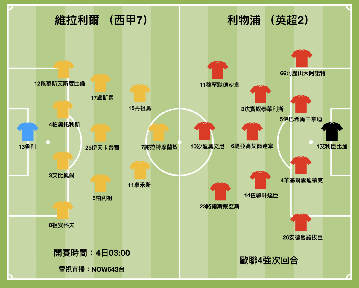 利物浦上仗憑佐敦軒達臣的幸運入波打開紀錄,沙迪奧文尼錦上添花完成2:0的勝仗。如果說比分和過程有幸運成份,那麼利物浦上仗與維拉利爾射門次數達到19:1之差,已控球率出現74%對26%的分野,都已經充份反映兩隊實力的分野。事實上,利物浦尚未用盡麾下進攻球員,已經綽綽有餘贏波,今仗路爾斯戴亞斯、沙迪奧文尼與穆罕默德沙拿勢率先掛帥爭取入波,迪亞高祖達、羅拔圖法明奴與奧歷治都能夠提供強大的支援,以他們高點迫搶的效率,利物浦仍然會控制今仗比賽節奏。