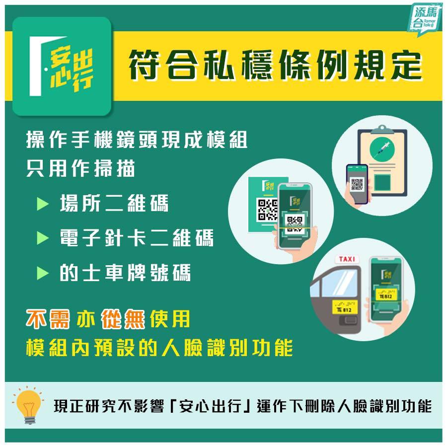 資科辦就事件與開發及運維的承辦商了解及跟進後,得悉承辦商在開發「安心出行」程式時應用了市場上一個現成的模組用以操作手機鏡頭,進行運作需要的掃描程序,即掃描及識別場所二維碼、電子針卡二維碼和的士車牌號碼等。除此以外,該模組並沒有進行任何其他運作。由於得悉有關模組亦同時包括人臉識別相關的預設功能,資科辦已要求承辦商研究在不影響程式正常運作的前提下,從模組中刪除與人臉識別相關功能,以釋除公眾疑慮。