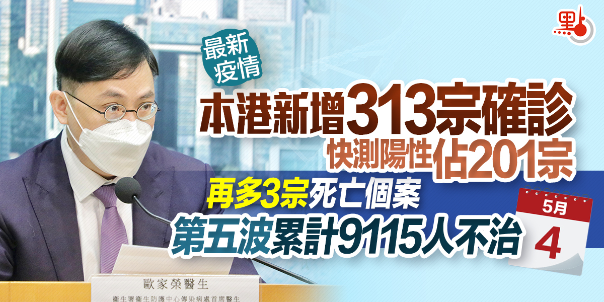 本港疫情逐漸回落,衞生署及醫管局今日(4日)下午舉行疫情記者會。衞生署衞生防護中心傳染病處首席醫生歐家榮公布,截至今日零時,本港新增313宗確診個案,當中112宗經核酸檢測確診,餘下201宗為快速抗原測試呈報陽性個案。新增個案中,包括22宗輸入個案,有2宗在抵港第12天檢測陽性,衞生防護中心料屬復陽個案。本港第五波疫情累計個案1192765宗。