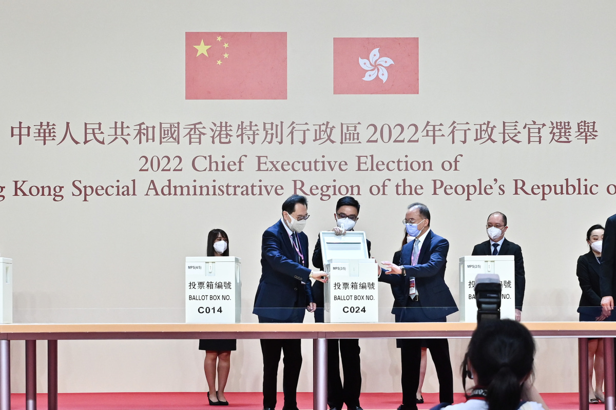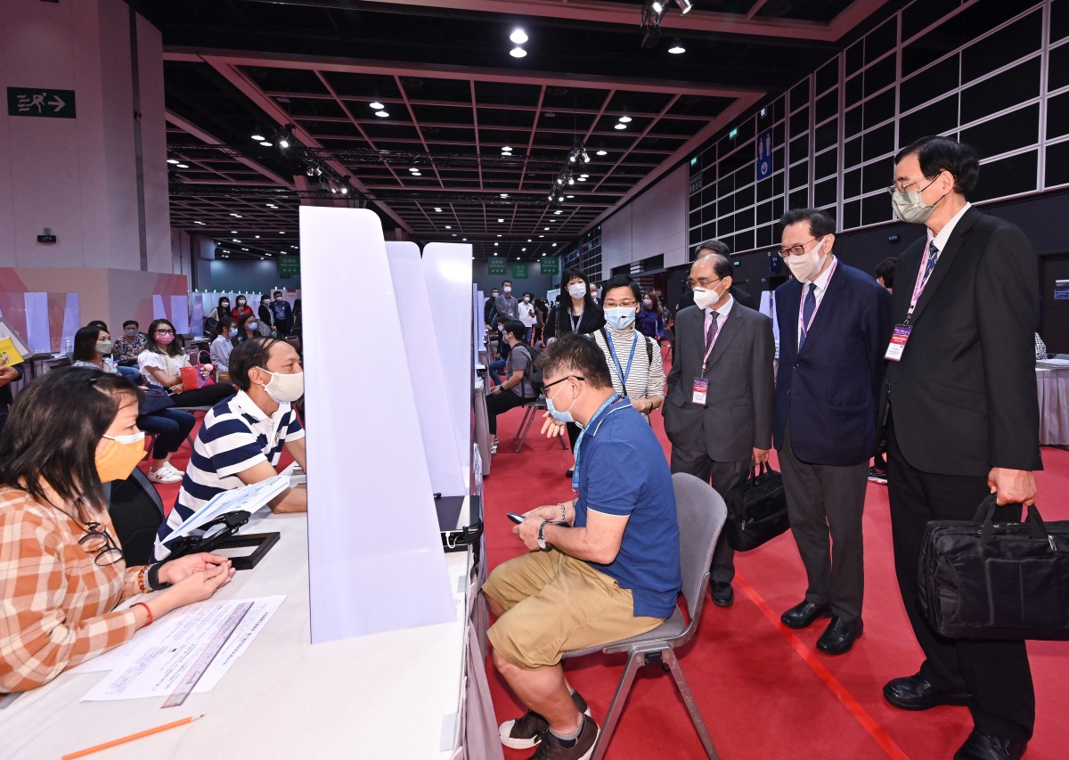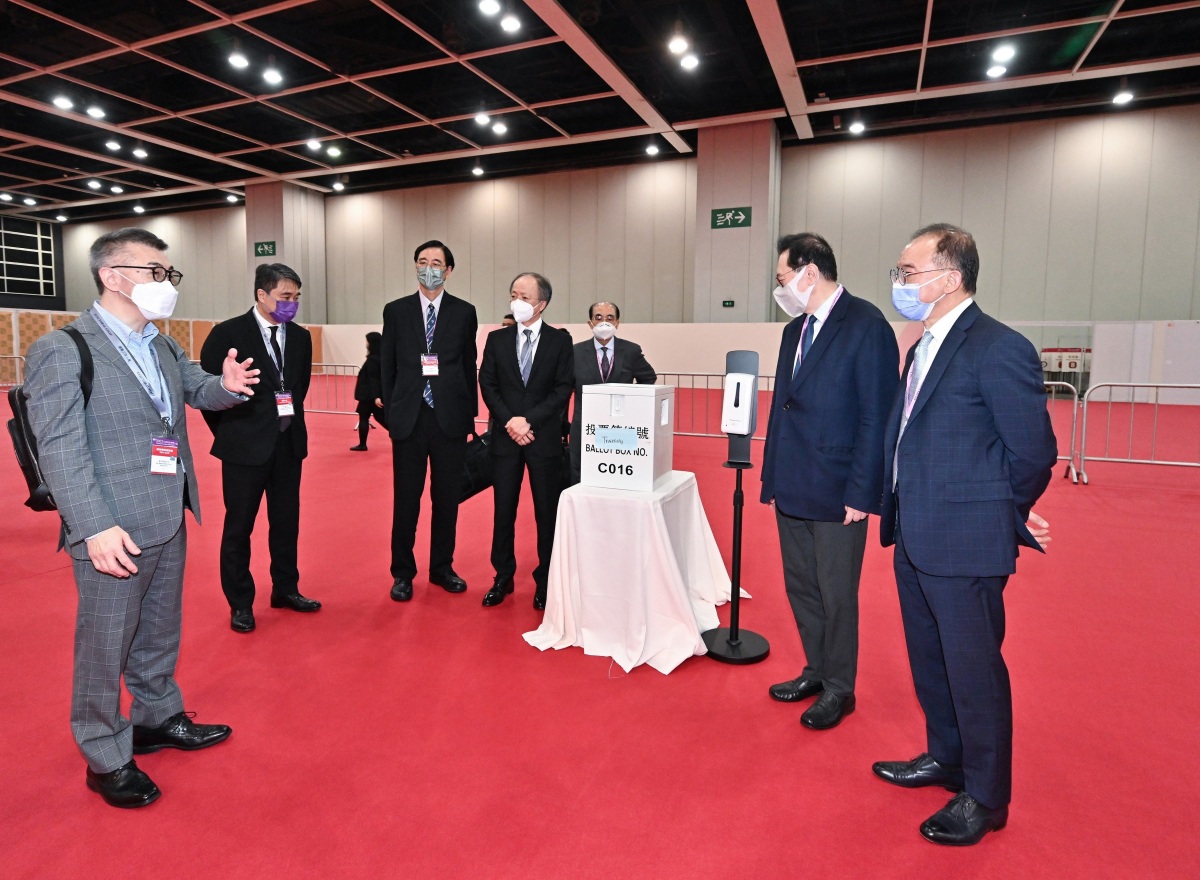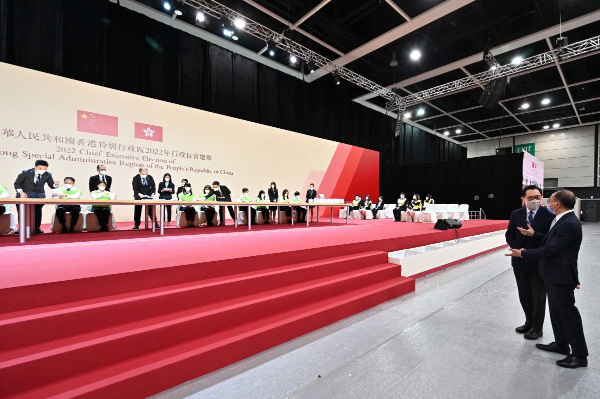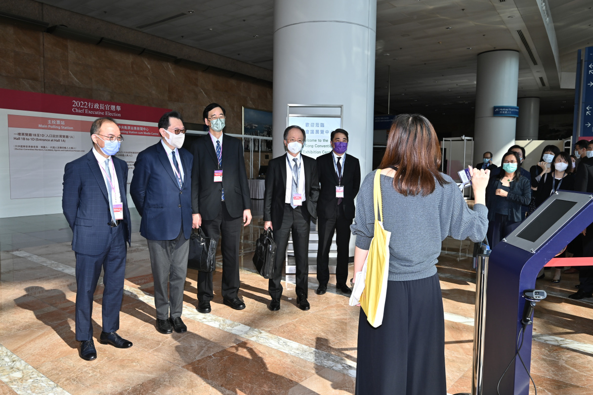完善選舉制度後的首場特首選舉將於星期日(5月8日)舉行。選管會主席馮驊法官聯同政制及內地事務局局長曾國衞,委員陸貽信資深大律師及石丹理教授與選舉主任楊家雄法官今日(4日)一同到設於香港會議展覽中心的主投票站及中央點票站,視察工作人員為2022年行政長官選舉投票日的工作進行實習和模擬情景演練。他們感謝同事的努力,並勉勵同事必須全力以赴,務求令星期日的投票和點票工作順利進行。