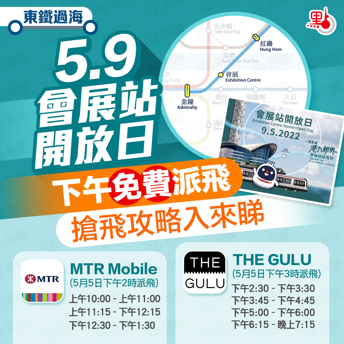 港鐵東鐵綫過海段定於5月15日通車,全新車站會展站同日啟用。港鐵會展站開放日則于下周一(9日)舉行,今日(5日)下午就可透過「MTR Mobile」及「THE GULU」兩個手機應用程式搶飛。