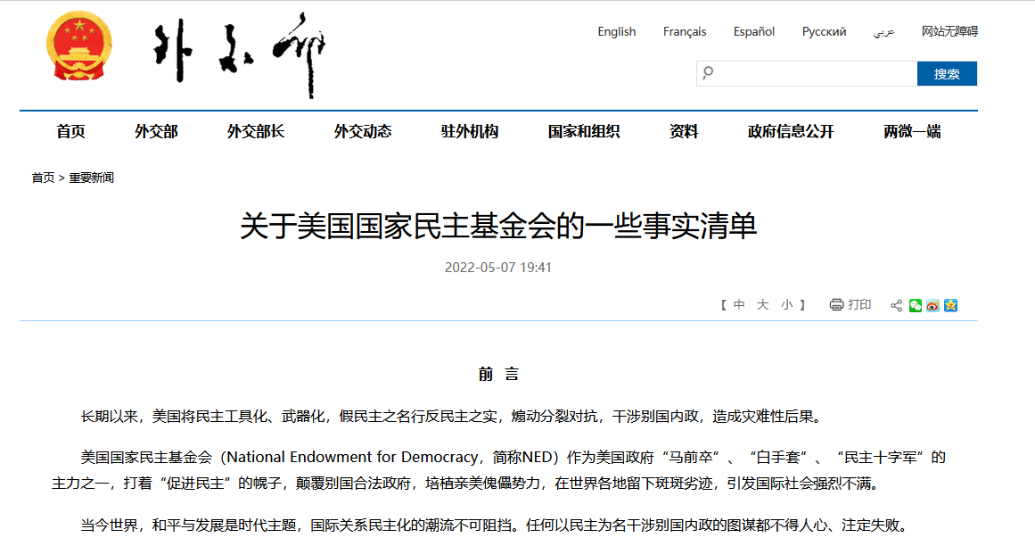 5月7日,外交部網站發布《關於美國國家民主基金會的一些事實清單》,詳細羅列美國國家民主基金會(NED)反中亂港的五大惡行,包含「策動顏色革命,意圖顛覆目標國政權」、「勾結當地政治團體,干預他國政治議程」、「資助分裂勢力,破壞目標國穩定」、「炮製虛假資訊,炒作反政府言論」、「資助活動和學術專案,搞意識形態滲透」。