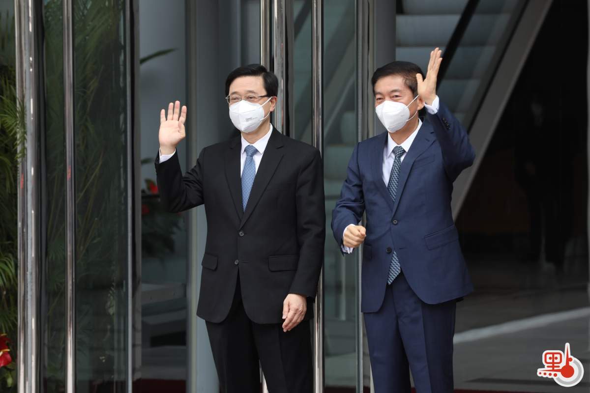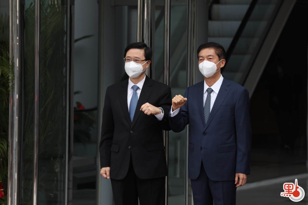李家超下車走進中聯辦大樓,中聯辦副主任陳冬、秘書長王松苗先上前迎接,互相以碰臂方式打招呼。李家超再走到駱主任面前,兩人先行恭手禮,再互相碰臂,並一起向傳媒揮手。