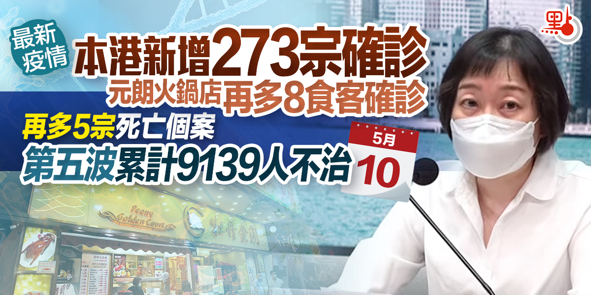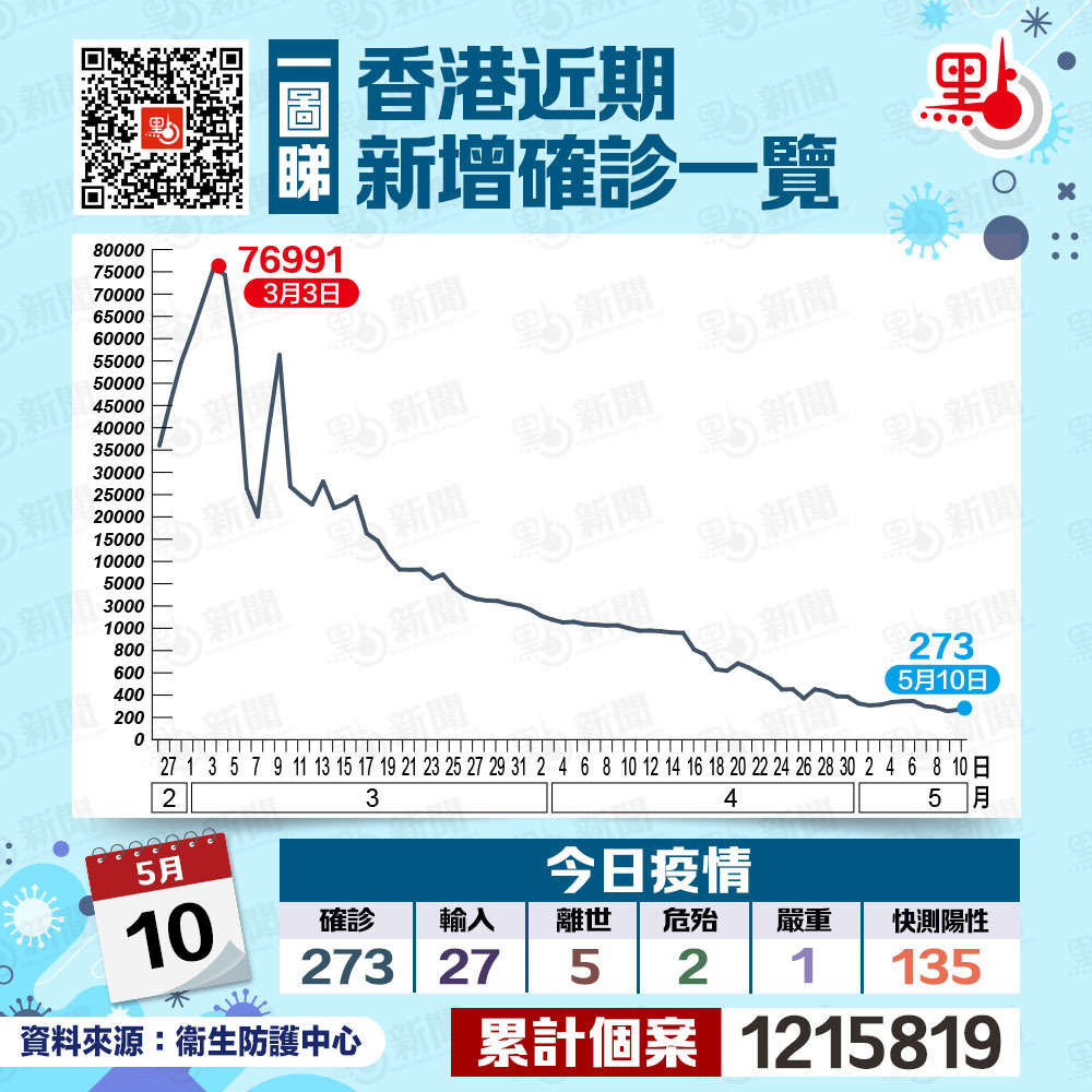 本港疫情逐漸回落,衞生署及醫管局今日(10日)下午舉行疫情記者會。衞生防護中心傳染病處主任張竹君公布,截至今日零時,本港新增273宗確診個案,當中138宗經核酸檢測確診,餘下135宗為快速抗原測試呈報陽性個案。新增個案中,包括27宗輸入個案。本港第五波疫情累計個案1194460宗。