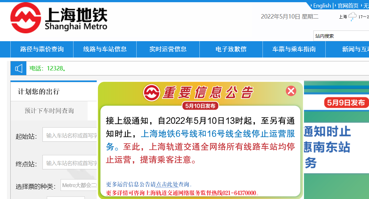 上海疫情回落,過去一日新增本土個案約3000宗,九成屬於無症狀感染。上海地鐵今日(10日)中午宣布,自今日13時起至另有通知時止,上海地鐵6號綫和16號綫全綫停止運營服務,至此,上海軌道交通全網路所有綫路車站均停止運營。