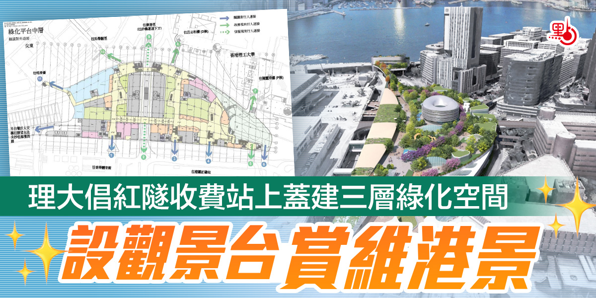 紅磡區人口稠密,加之毗鄰理大、港鐵紅磡站、紅磡海底隧道收費廣場,以及酒店和商業中心林立的尖東,令區內出現人多車多、空氣質素欠佳、缺乏大型綠化公園和康文設施等問題。有見及此,理大團隊提出在紅隧收費廣場上,興建一個佔地約3萬平方米的綠化平台,連接紅磡港鐵站、尖東、尖沙咀海濱長廊、香港體育館、唯港薈及理大主校園。不但為市民提供一個大規模的綠色公共生活空間,亦有助推動本港的可持續發展。