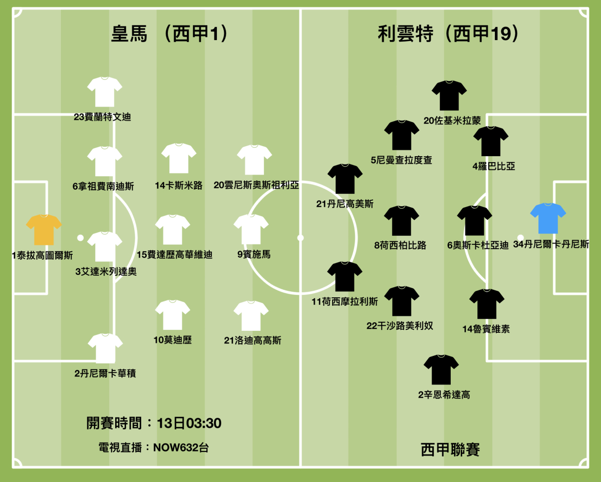 西甲勁旅皇馬在穩奪聯賽錦標和勇勝曼城晉級歐聯決賽雙喜臨門下,上仗在馬德里市打吡戰,吃了同市宿敵馬德里體育會一記悶棍,如今他們遇到護級隊伍利雲特,只要皇馬今仗贏波,就幾乎肯定會送利雲達「上路」,令對方護級失敗。(香港時間周四凌晨三時三十分開賽,NOW632台直播)