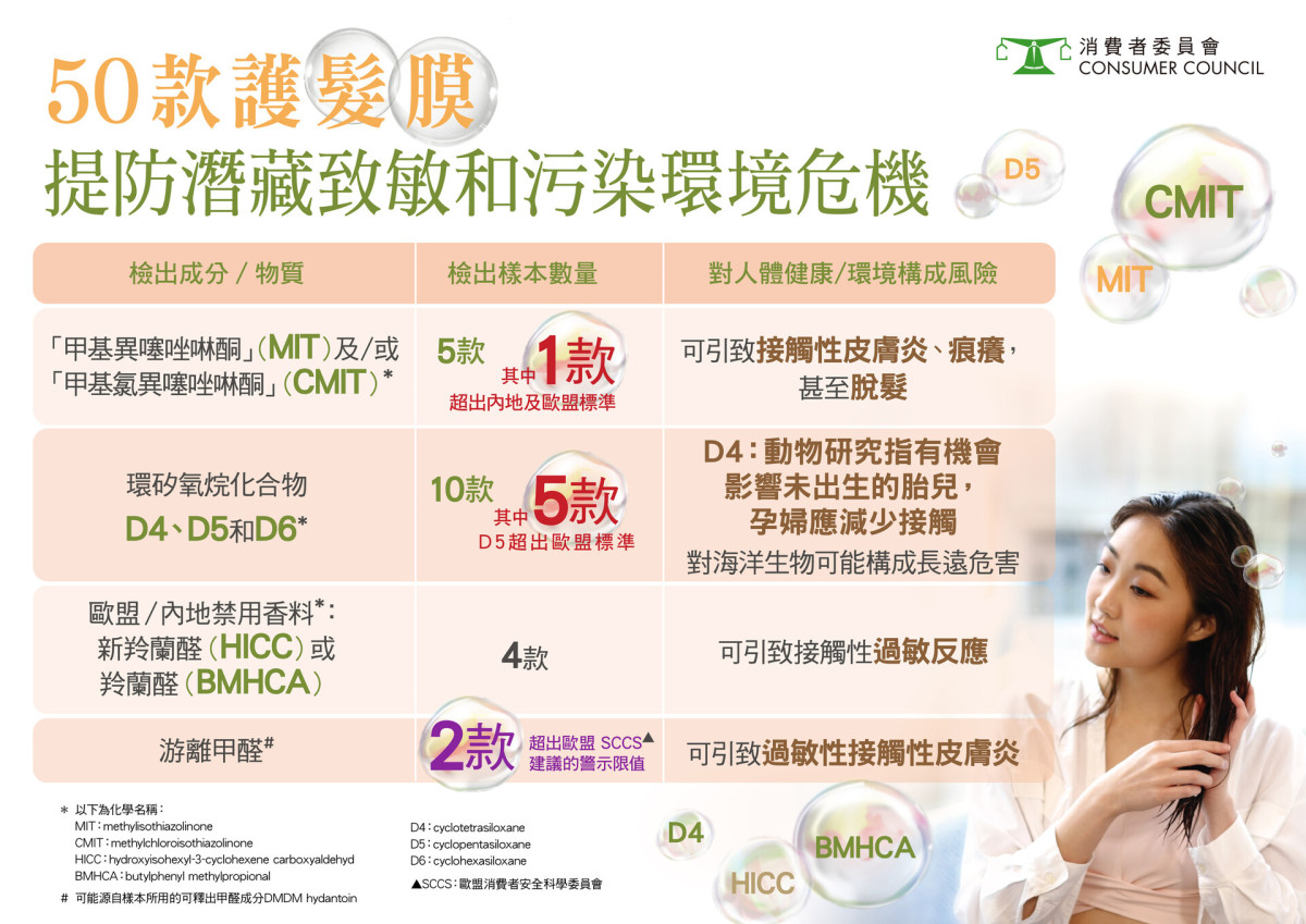 不少經常燙染頭髮的人士會選用髮膜進行護理,那麼市面上的髮膜安全有效性如何呢?消委會今日(16日)表示,通過測試市面上50款沖洗式髮膜,發現逾8成存致敏風險,部分檢出歐盟禁用的香料物質。若經常使用該等產品及長時間接觸皮膚,有機會增加皮膚出現過敏反應的風險,可能出現痕癢、灼熱,甚至有脫髮情況。另有5款樣本檢出過量環矽氧烷化合物D5,長期使用可能對生態環境構成影響。