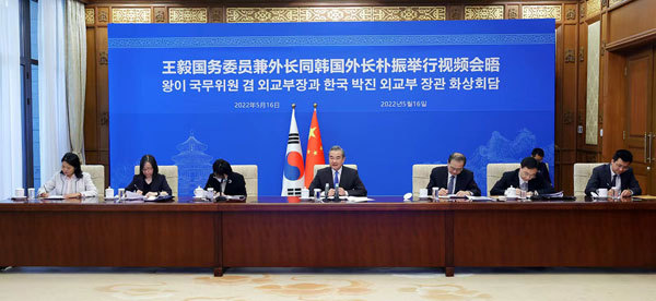 5月16日,國務委員兼外長王毅同韓國新任外長朴振舉行視頻會晤。