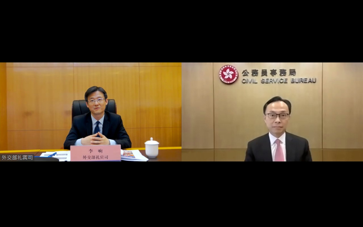公務員學院今日(20日)與外交部駐香港特別行政區特派員公署舉辦第五場「國家外交事務系列」講座,由外交部禮賓司副司長李響透過視像形式主講,主題為「禮賓禮儀」。約270名首長級和高級公務員在網上實時參與今日的講座。