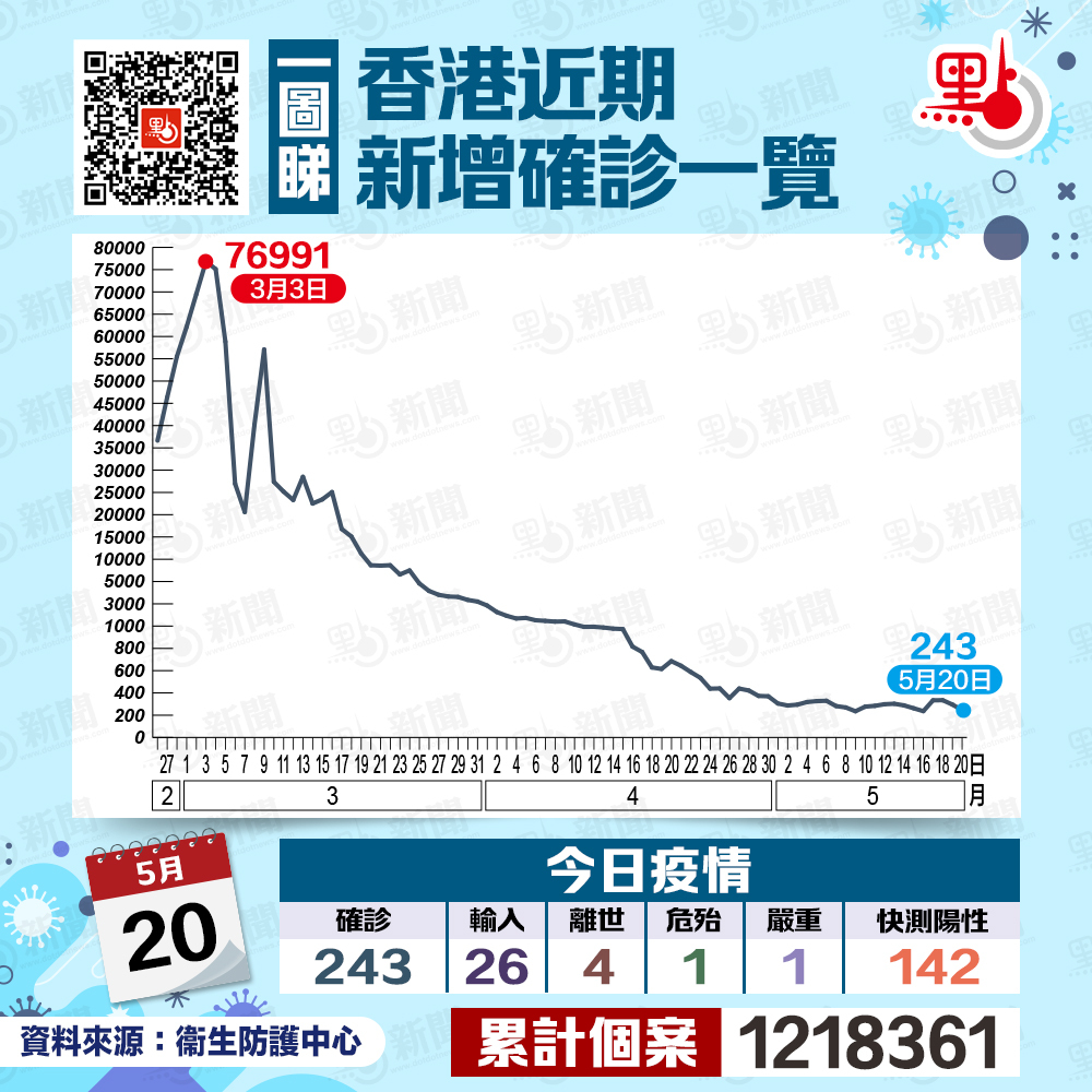 本港第五波疫情緩和,衞生署及醫管局今日(20日)下午舉行疫情記者會。衞生署衞生防護中心傳染病處首席醫生歐家榮公布,截至今日零時,本港新增243宗確診個案,當中101宗經核酸檢測確診,142宗為快測陽性個案。新增個案中,包括26宗輸入個案。本港第五波疫情累計1197300宗個案。