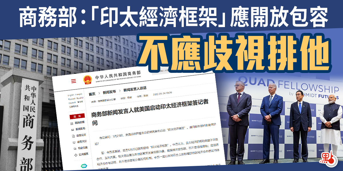 5月23日,美國總統拜登在訪日期間宣布啟動「印太經濟框架」。中國商務部新聞發言人今日(24日)回應指,中方注意到,美方5月23日宣布啟動「印太經濟框架」。中方認為,亞太經濟的成功受益於開放合作、互利共贏。相關倡議要為本地區繁榮發展貢獻力量,應保持開放包容,而不是歧視排他;應促進經濟合作與團結,而不是損害和分裂現有機制。中方一直以來對符合上述標準的地區經濟合作倡議均持開放態度。
