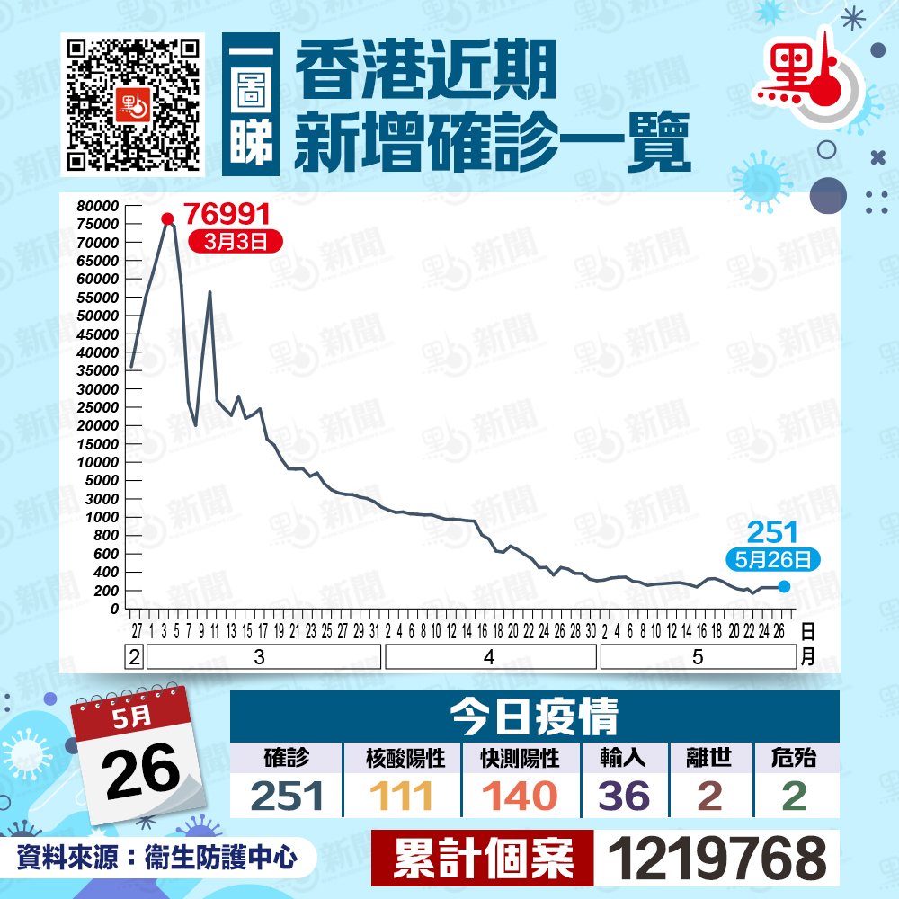 本港第五波疫情緩和,衞生署及醫管局今日(26日)下午舉行疫情記者會。衞生署衞生防護中心傳染病處主任歐家榮公布,截至今日零時,本港新增251宗確診個案,當中111宗為核酸檢測確診,140宗為快測陽性個案。新增個案中,包括36宗輸入個案。本港第五波疫情累計1198707宗個案。