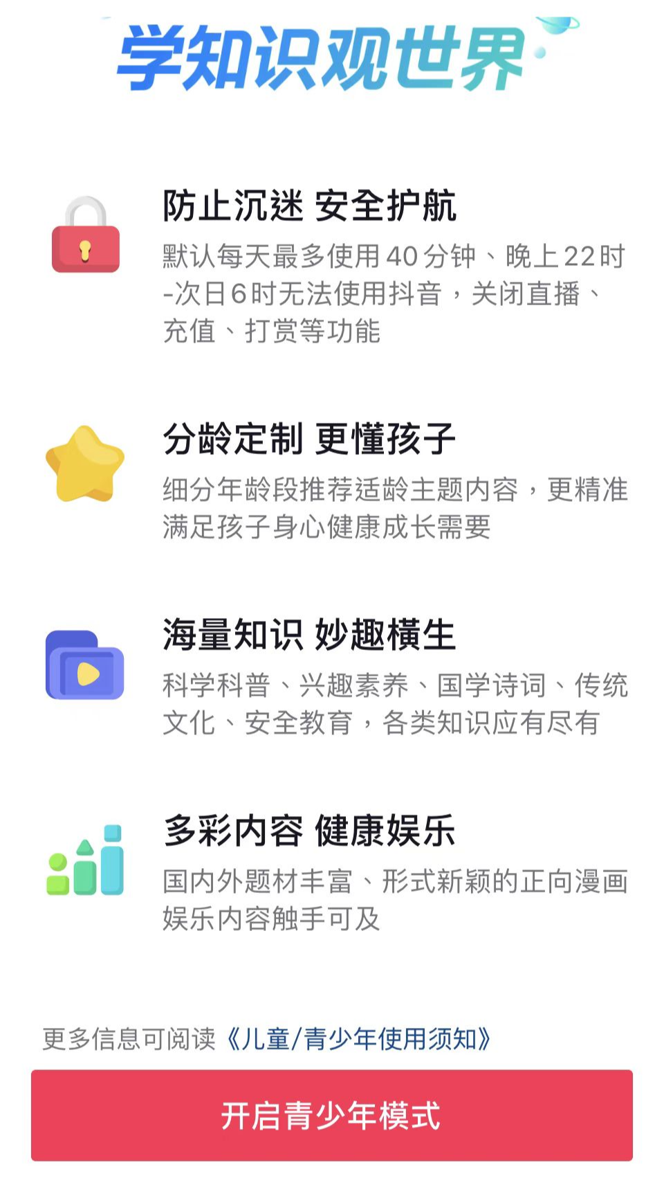 抖音今日(26日)宣布,在落實青少年模式無法看播、充值、消費等基礎上,對於沒有及時開啟青少年模式的用戶,再次升級相關攔截能力。